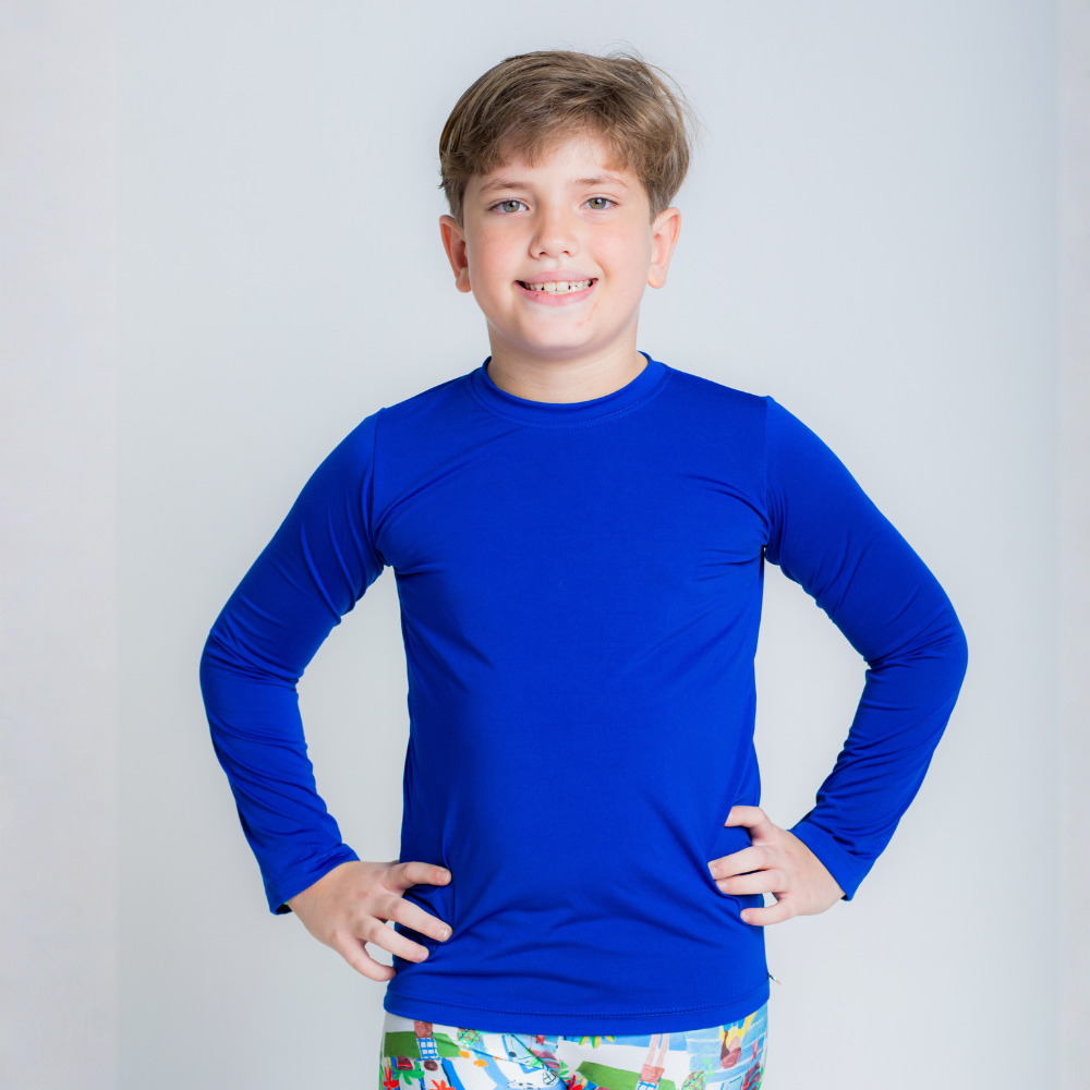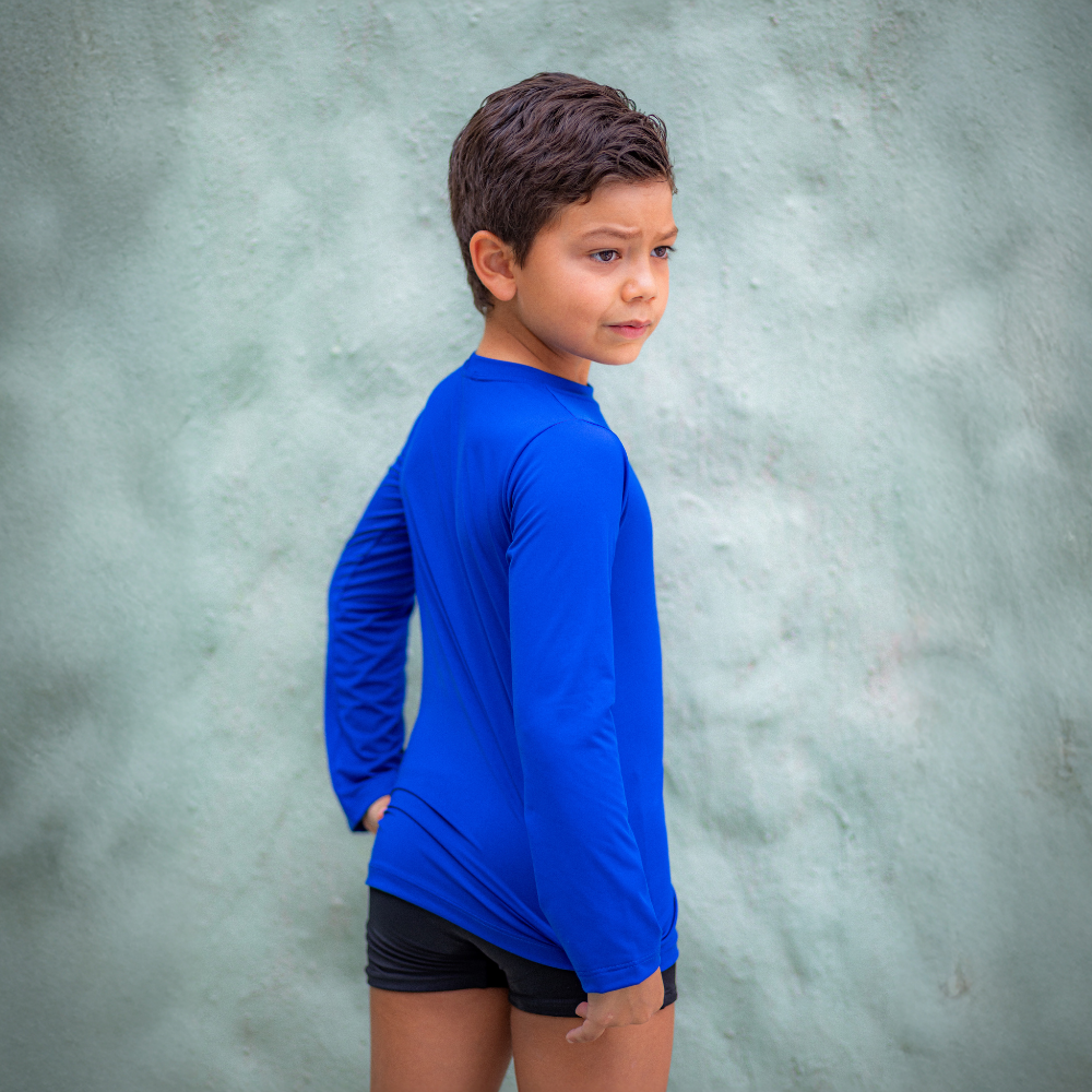 A Camisa de proteção UV Azul é confeccionada em poliamida macia pensando no extremo conforto das crianças, com proteção UV+50, tecnologia de secagem rápida, e com o conforto térmico que a poliamida proporciona! Com modelagem que se ajusta confortavelmente ao corpo e manga longa, é perfeita para as atividades ao ar livre, pois proporciona liberdade de movimentos, segurança e proteção.