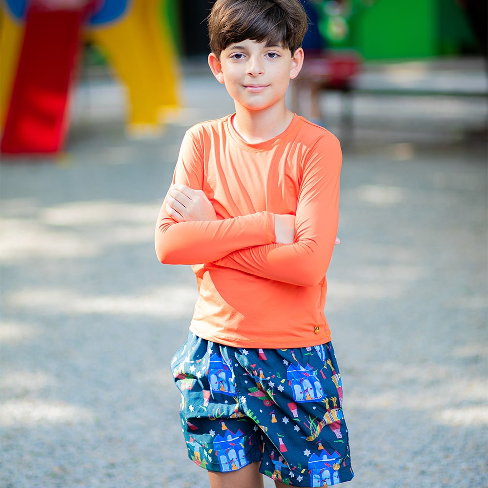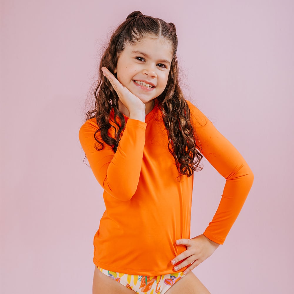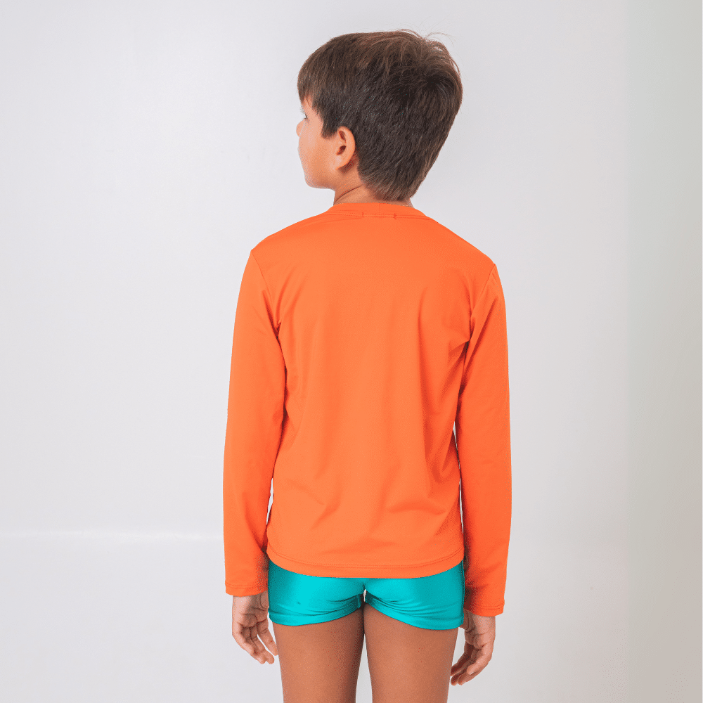 A Camisa de proteção UV Laranja é confeccionada em tecido macio pensando no extremo conforto das crianças, com proteção UV+50, tecnologia de secagem rápida, e com conforto térmico! Com modelagem que se ajusta confortavelmente ao corpo e manga longa, é perfeita para as atividades ao ar livre, pois proporciona liberdade de movimentos, segurança e proteção. Tem um toque macio e alta respirabilidade, que facilita a evaporação do suor e ajuda a manter a temperatura corporal regulada, mesmo nos dias mais quentes! Possui design unissex e versátil, e combina com tudo, para deixar as crianças protegidas e cheias de estilo enquanto brincam ao sol!