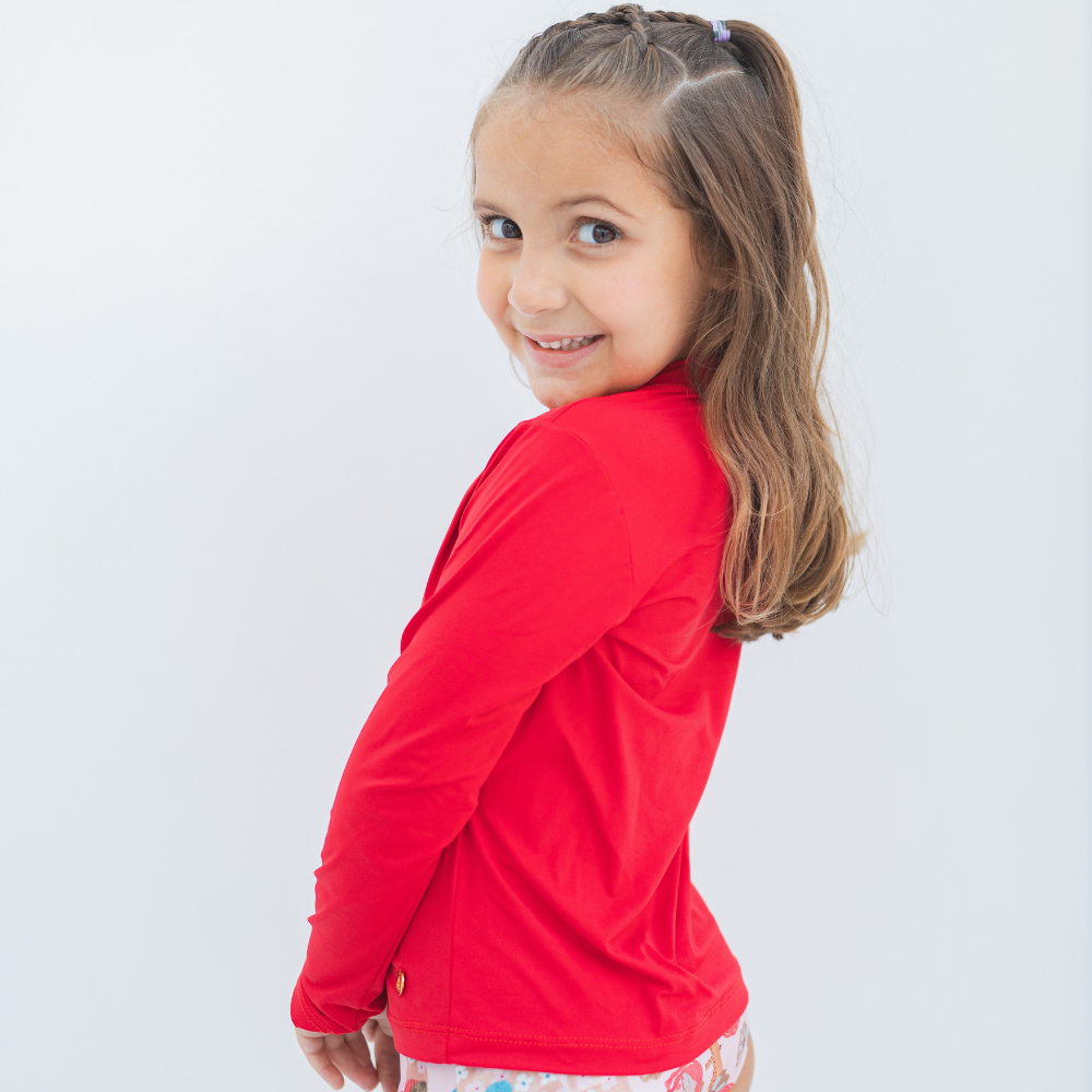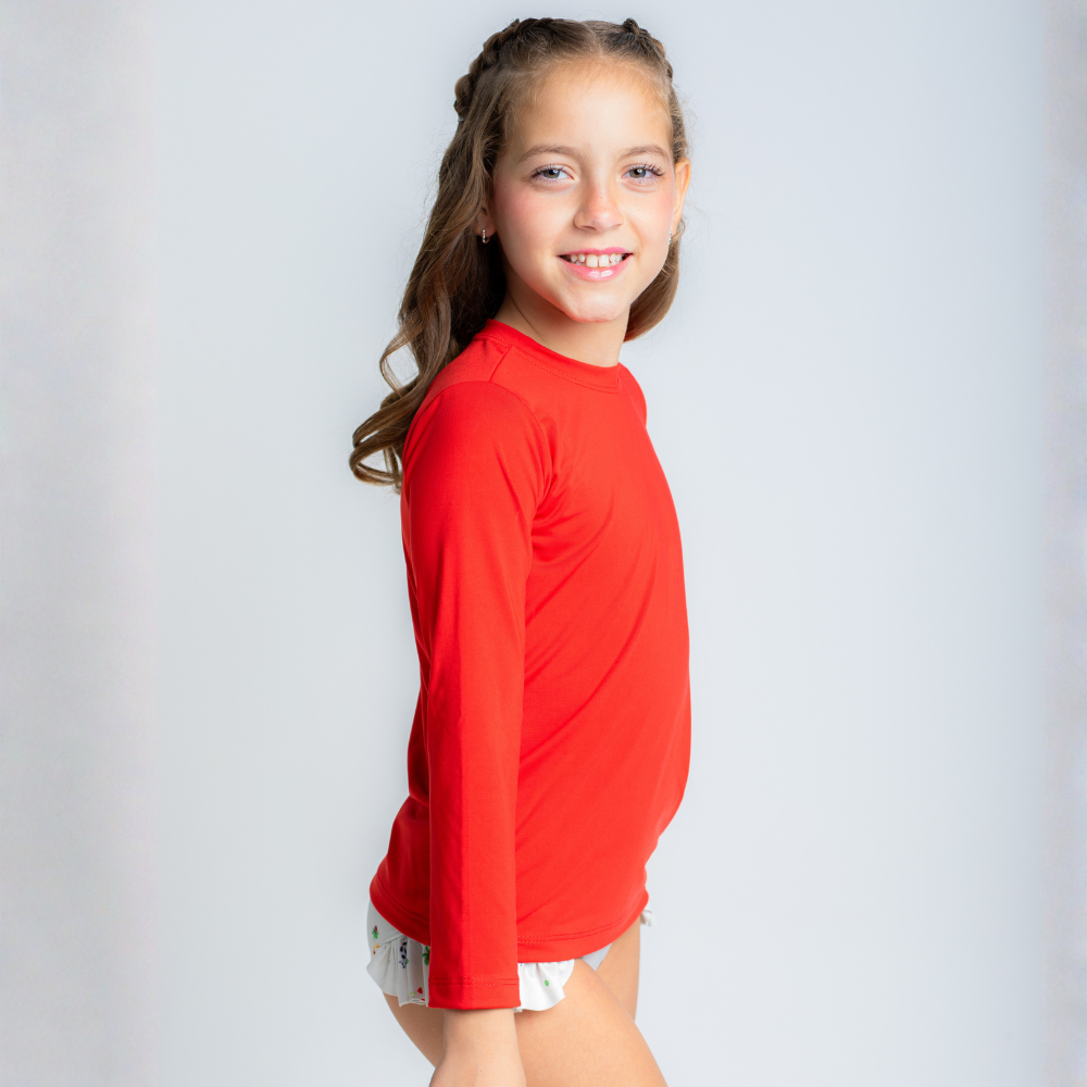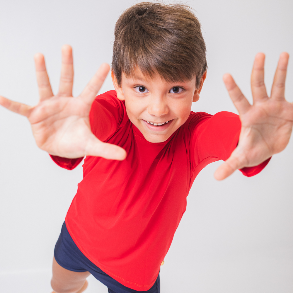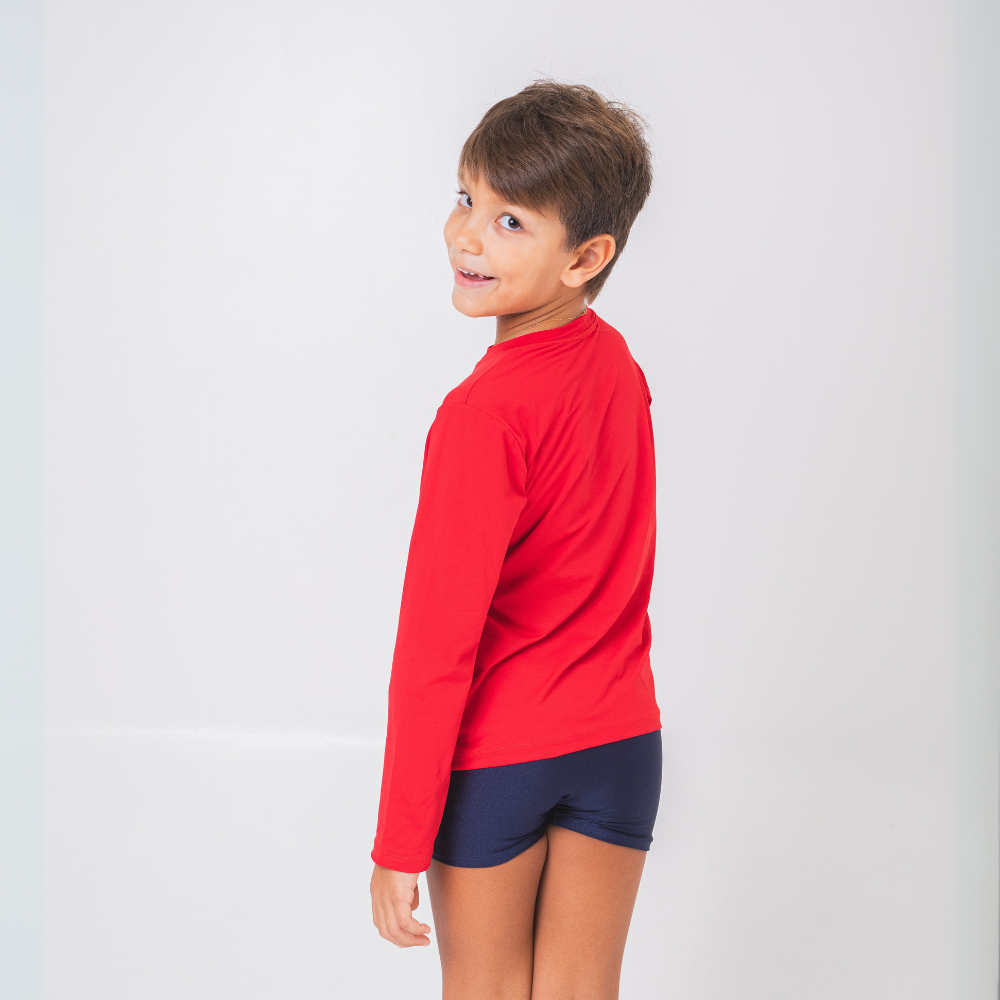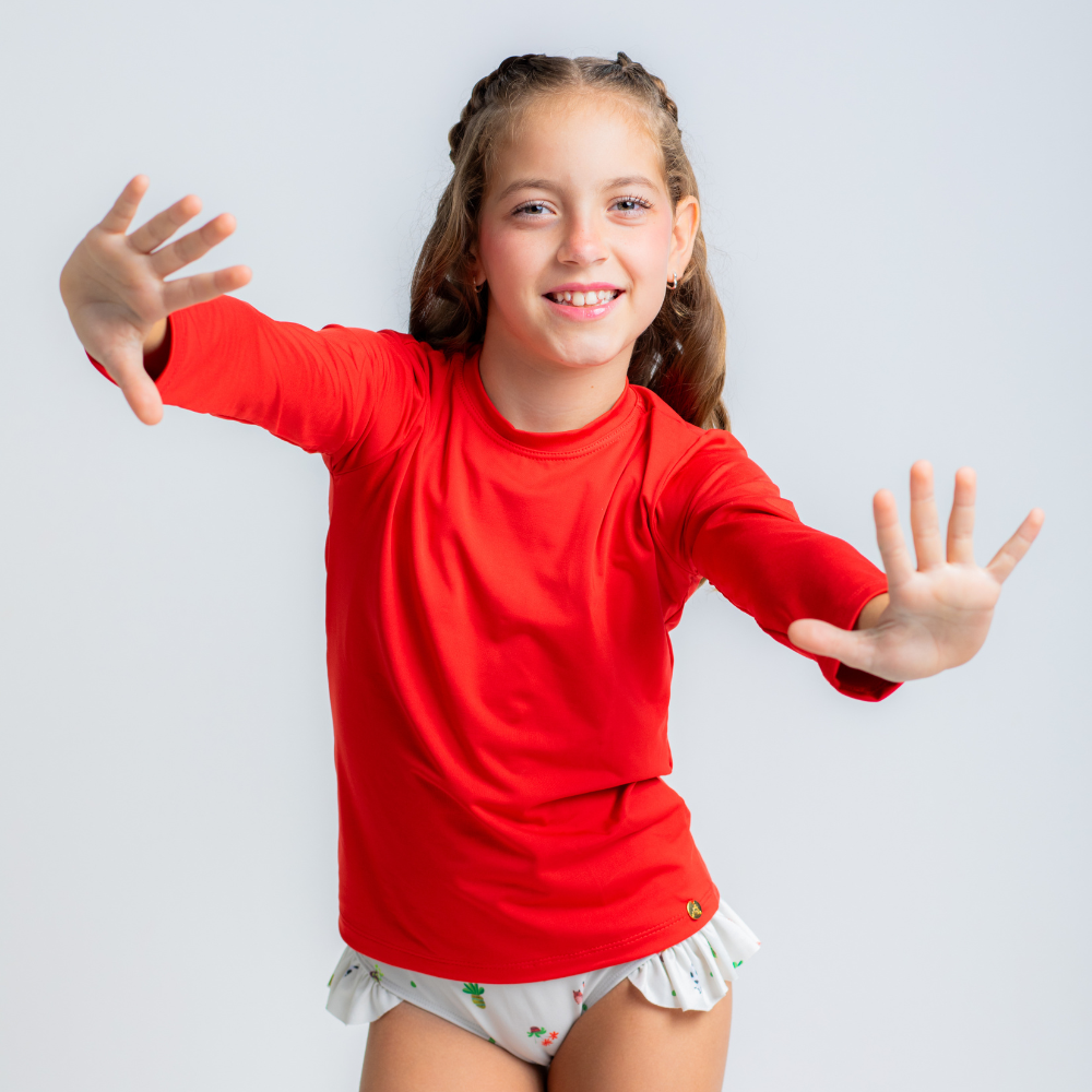 A Camisa de proteção UV Vermelha é confeccionada em tecido macio de poliamida pensando no extremo conforto das crianças, com proteção UV+50, tecnologia de secagem rápida, e com conforto térmico! Com modelagem que se ajusta confortavelmente ao corpo e manga longa, é perfeita para as atividades ao ar livre, pois proporciona liberdade de movimentos, segurança e proteção. Tem um toque macio e alta respirabilidade, que facilita a evaporação do suor e ajuda a manter a temperatura corporal regulada, mesmo nos dias mais quentes! Possui design unissex e versátil, e combina com tudo, para deixar as crianças protegidas e cheias de estilo enquanto brincam ao sol!