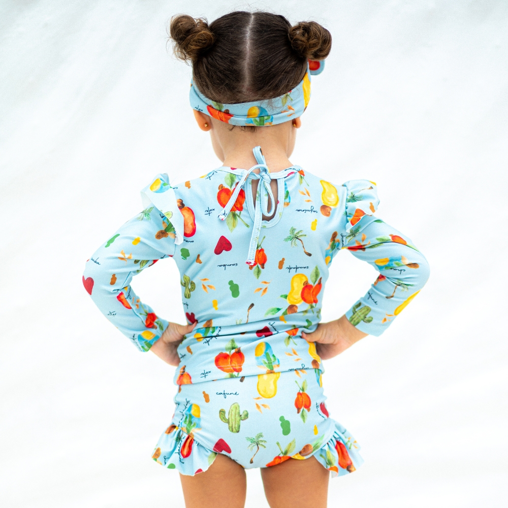 O Conjunto Baby Menina Dengo é confeccionado pensando no extremo conforto para seu bebê. Possui proteção UV 50+ e forro confortável. Com modelagem linda, possui calcinha com babadinho na lateral, e blusinha de manga comprida protetora do sol com abertura nas costas, para facilitar a hora de vestir, trazendo ainda babadinho no ombro, como detalhe de puro charme! É um conjunto cheio de estilo, mas sem esquecer da proteção necessária aos bebês. Acompanha faixa de cabelo, para garantir um look ainda mais completo.