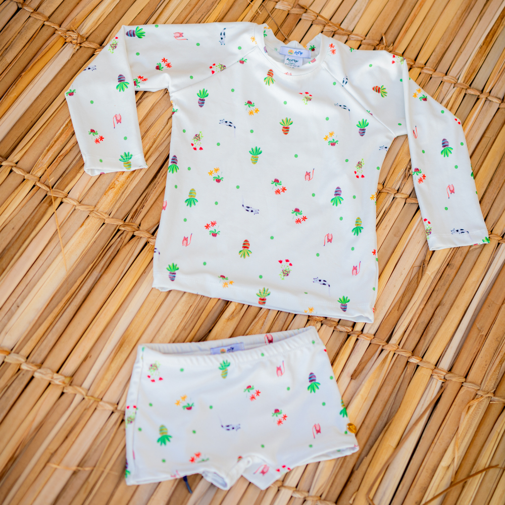 O Conjunto Baby Menino Gatinhos é confeccionado pensando no extremo conforto para seu bebê. Com modelagem linda, possui sunga shortinho com cordão interno para ajuste na cintura, e blusinha de manga comprida protetora do sol, com modelagem super prática e versátil! É um conjunto cheio de estilo, mas sem esquecer da proteção necessária aos bebês. Possui proteção UV 50+.