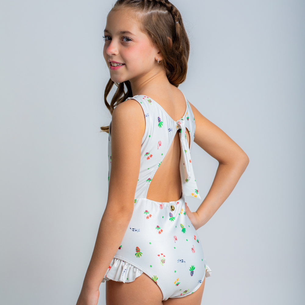 O Maiô Nó Gatinhos é confeccionado pensando no extremo conforto das crianças. Com modelagem linda, possui decote arredondado nas costas, com detalhe de nozinho que garante o ajuste ideal, deixando a peça super confortável. Possui calcinha com babadinho na lateral que é puro charme! É um maiô prático e lindo! Possui proteção UV 50+.